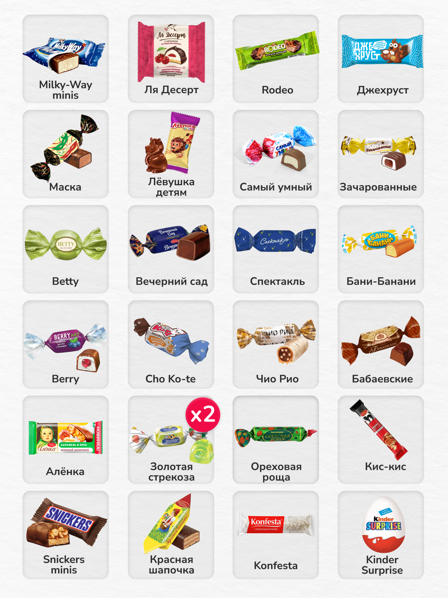 Шоколадные, Карамельные, Вафельные